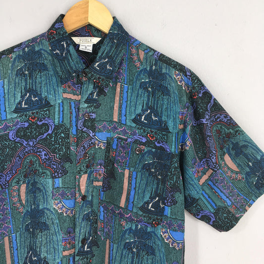 Abstract Fountain Blue Casual Silk Shirt Small