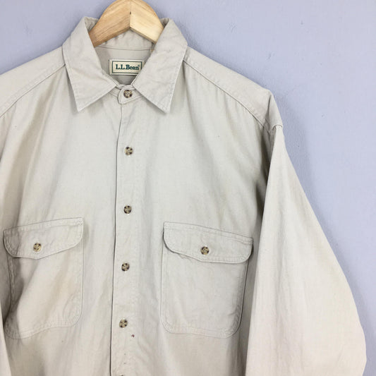 LL Bean Flannel Plain Beige Shirt Mens Medium