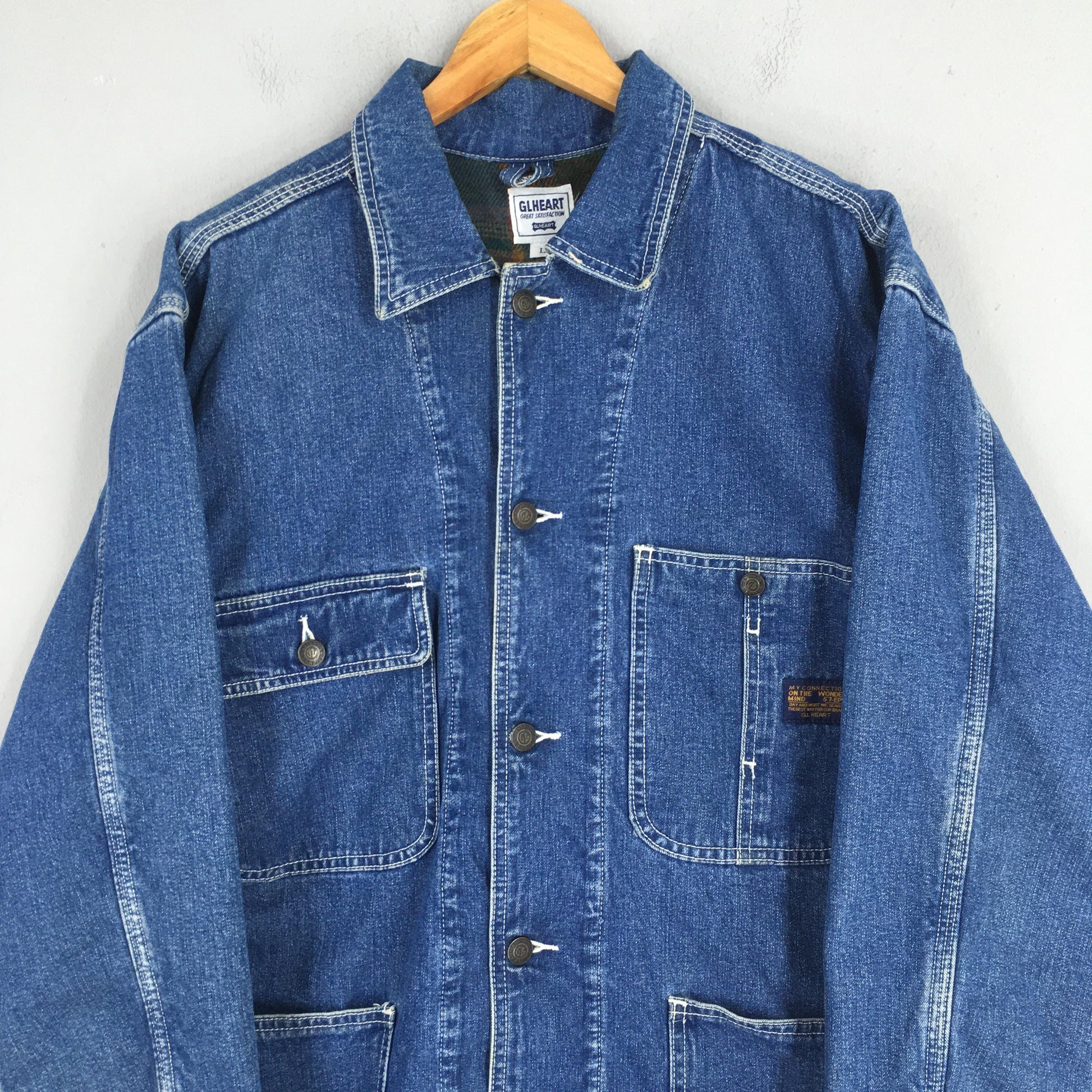 Vintage 1980's GL Heart Sanforized Denim Worker Jacket Large Union Made Blue Chore Denim Menswear Four Pocket Jacket 50s Blanket Coat Size L