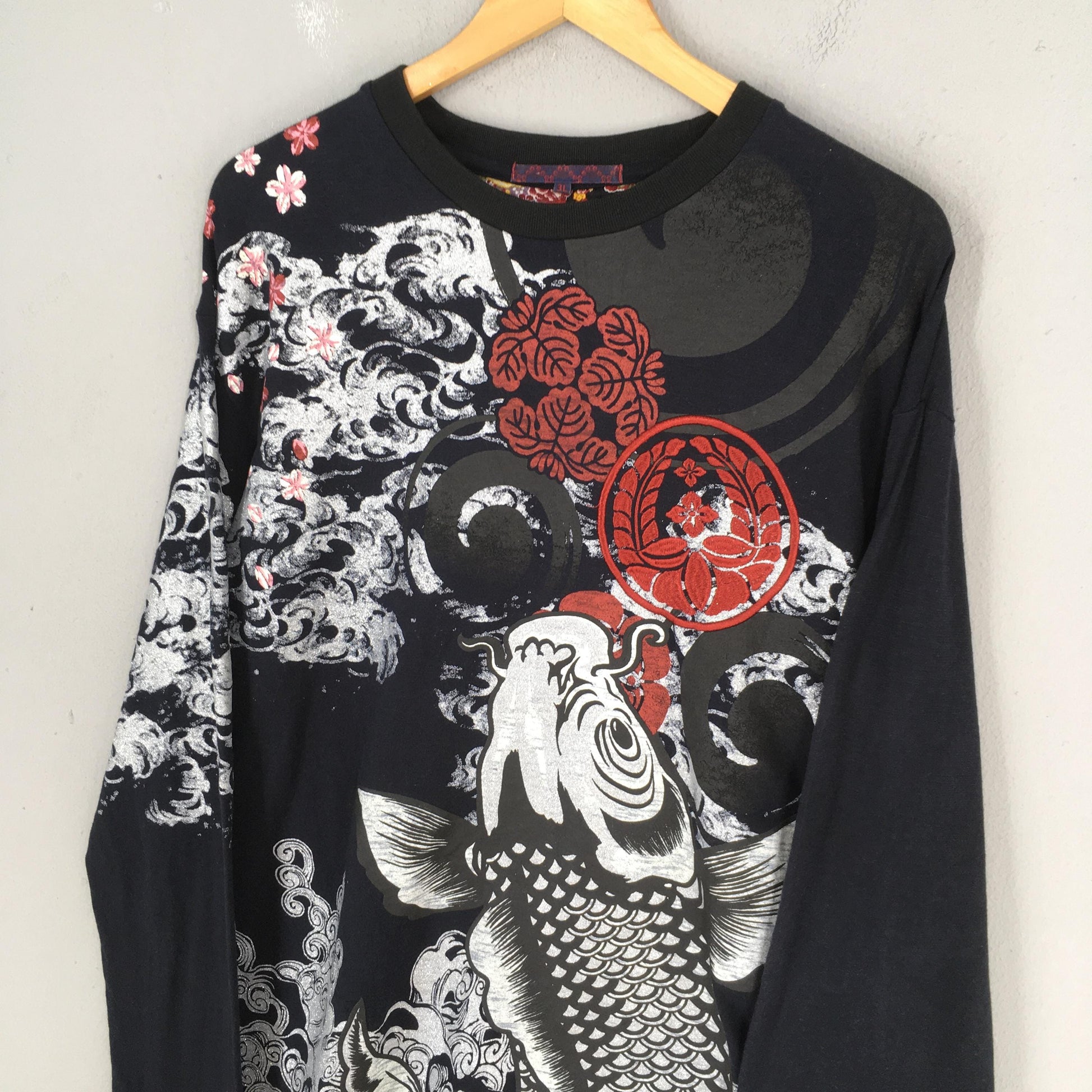 Vintage Fish Koi Japanese Culture Sukajan Black Tshirt XLarge Koi Pond All Over Print Japanese Tattoo Style Souvenir Long Sleeve Tee Size XL